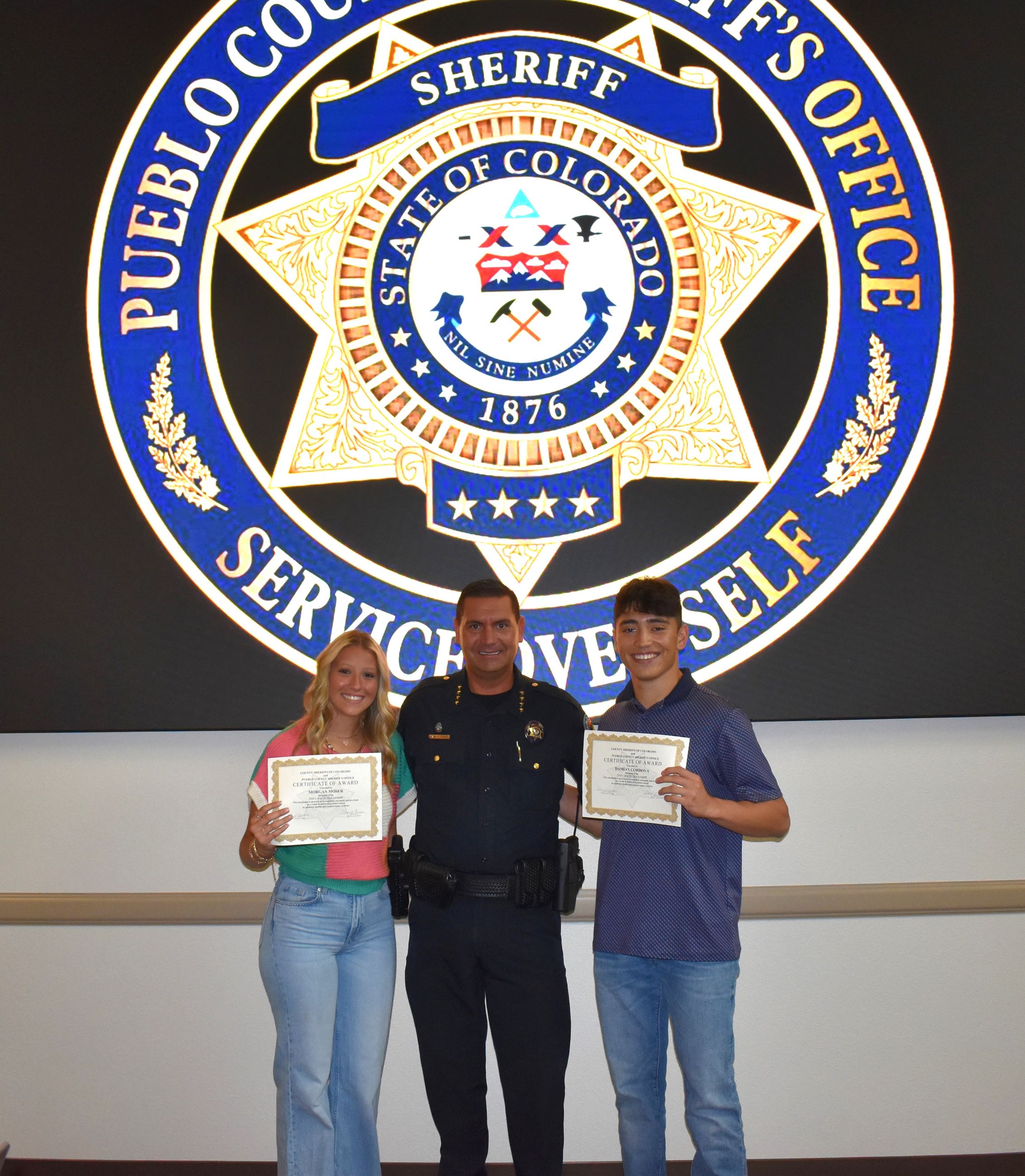 Pueblo, CO: Pueblo County Sheriff David J. Lucero today awarded two local high school seniors with the 2025 County Sheriffs of Colorado Scholarship. Pueblo County High School’s Morgan Moser and South High School’s Damien Cordova were each awarded a $1,000 scholarship through the Pueblo County Sheriff’s Office.